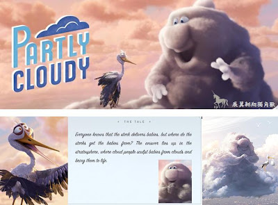 依循以往Pixar慷慨慣例,在主檔電影開始之前,仍是附贈前菜短片一盤。如今回想起來,這次的片頭短片【Partly Cloudy】,極其精簡卻又笑點十足。竟還比主要故事【天外奇蹟Up】,更加令我印象深刻。