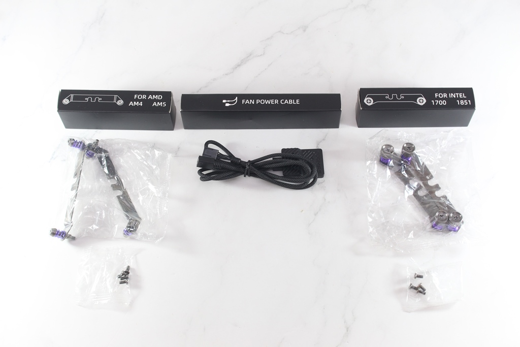 ▼配件都有分類做包裝,有Intel扣具、AMD扣具、強化背板、各平台固定螺絲與風扇連接線(包含電源與ARGB控制)